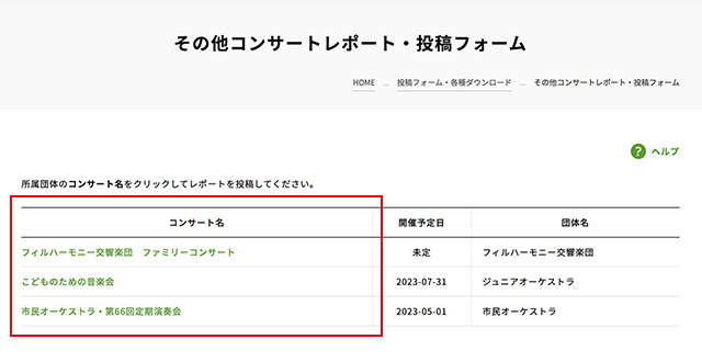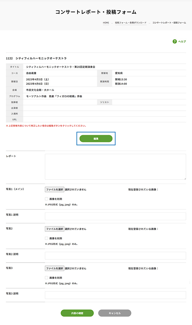 (一度投稿したコンサートを修正する場合は事務局発行のパスワードが必要です)