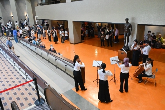 ホワイエでは大学生団員が心を込めたウェルカム演奏を披露。温かな音色で来場者をお迎えし、演奏会の始まりを華やかに彩りました。音楽によるおもてなしに、会場には笑顔と和やかな雰囲気が広がりました。