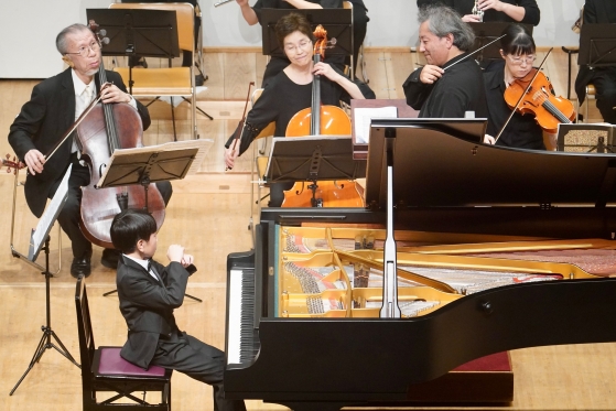 本番の様子。モーツァルト23番(Adur)の3楽章を担当した戸田康介くん(小4)。